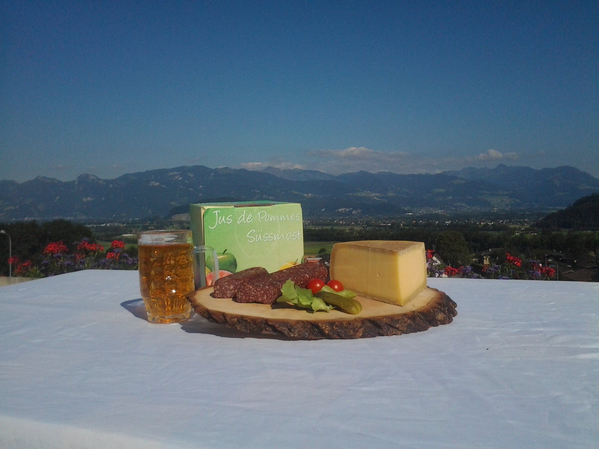 Neben dem Schlafraum ist ein Aufenthalts- und Essraum eingerichtet. Diesen Raum kann man auch mieten, z.B. für Geburtstagspartys. Das Frühstück wird im Bauernhaus oder bei grösseren Gruppen in der Scheune eingenommen. Bei schönem Wettter steht unsere Terrasse zur Verfügung. Wir bieten Ihnen ein reichhaltiges, typisches Bauernfrühstück mit Milch, Kaffee, Ovo, Käse, Brot, Butter, Konfitüre etc. und nach Wunsch Original Rheintaler-Ribel AOC und vieles mehr.